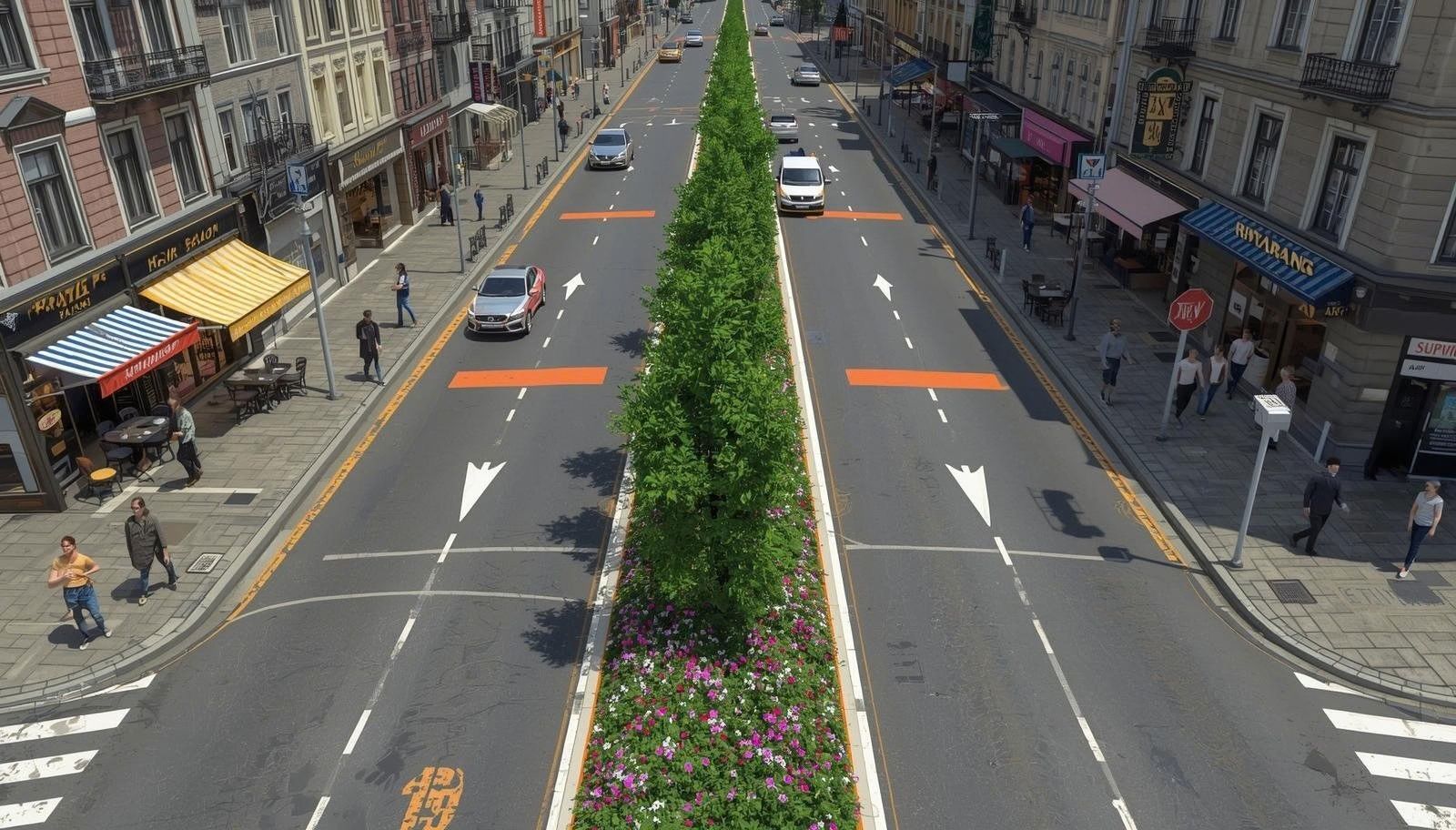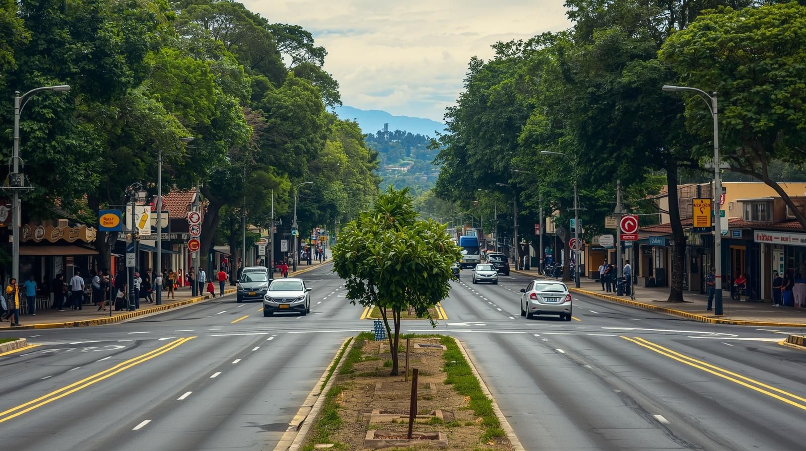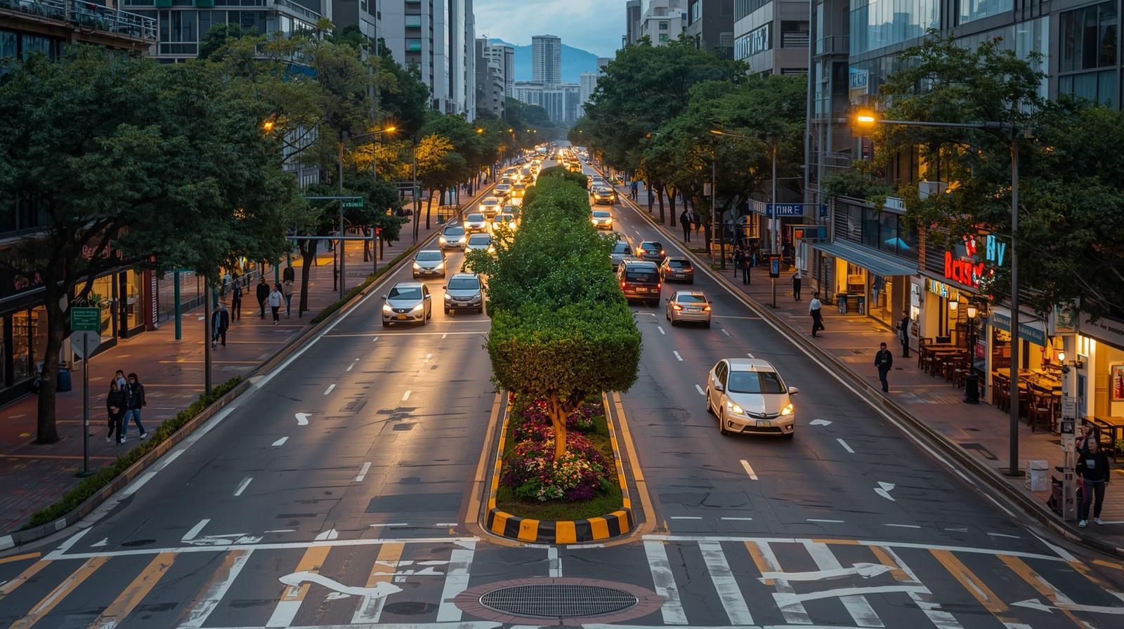 VISIÓN DE MEJORAMIENTO DEL ENTORNO URBANO: Ejemplo de referencia visual de un corredor comercial Calle 53 con paisajismo urbano, espacios ordenados y comercio activo. La imagen ilustra cómo la organización del espacio público, el paisajismo urbano y el cuidado del entorno pueden transformar sectores comerciales de barrio.